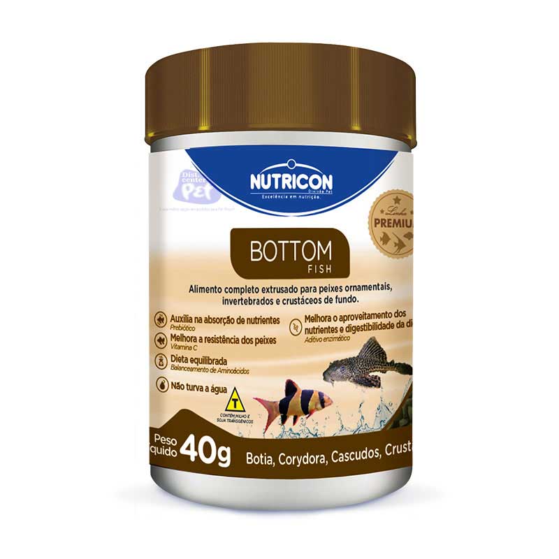 O Bottom Fish é um alimento completo e extrusado, desenvolvido para peixes ornamentais e invertebrados que habitam os fundos de aquários. Atinge o fundo rapidamente devido a sua consistência. Formulado à base de ingredientes de alta qualidade e digestibilidade.